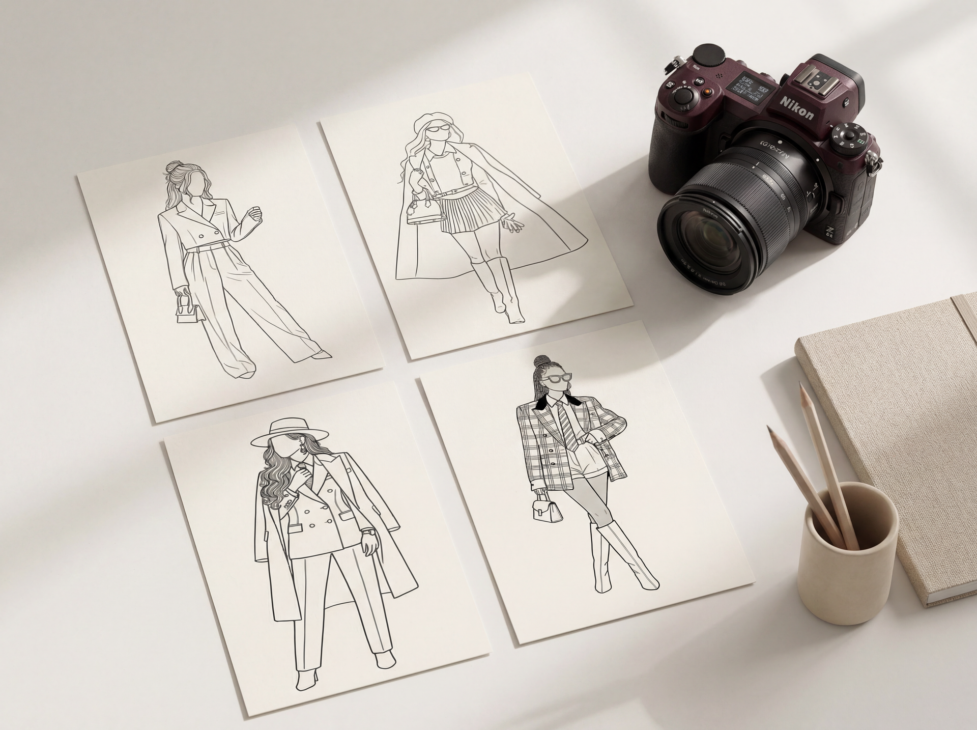 A collectible coloring book brand inspired by fashion illustration, minimal design, and quiet luxury aesthetics.